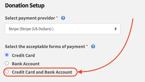 Whether you are creating a new page or editing an existing one, you’ll add the ACH option from the Setup step, which is the second page of the process. There, scroll down to the “Donation Setup” section. Make sure Stripe is selected as the payment provider. Below that, you’ll see radio buttons to select forms of payment. Select the “Credit Card and Bank Account” option to offer both. If desired, you also have the option to offer only bank account payments.