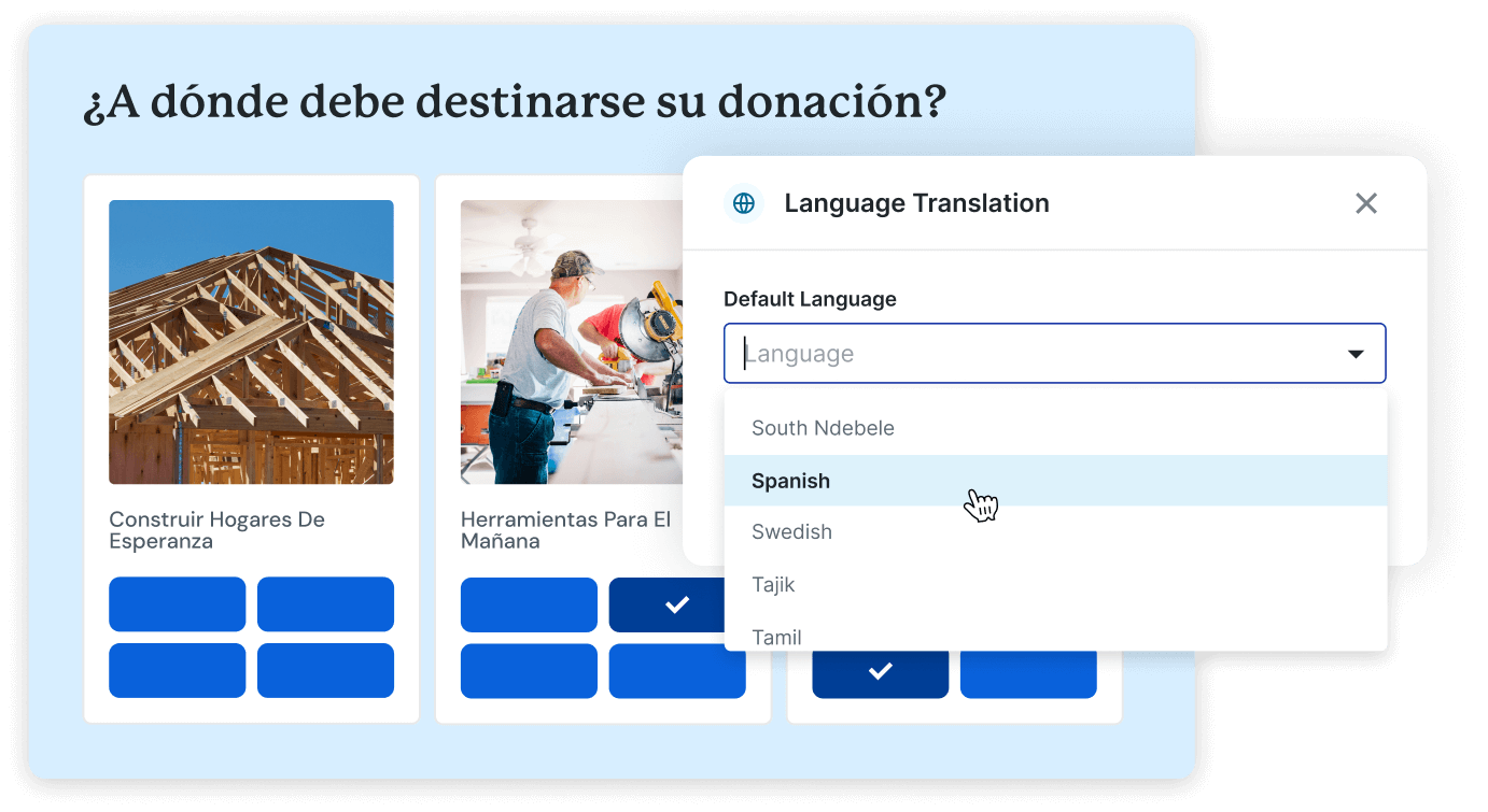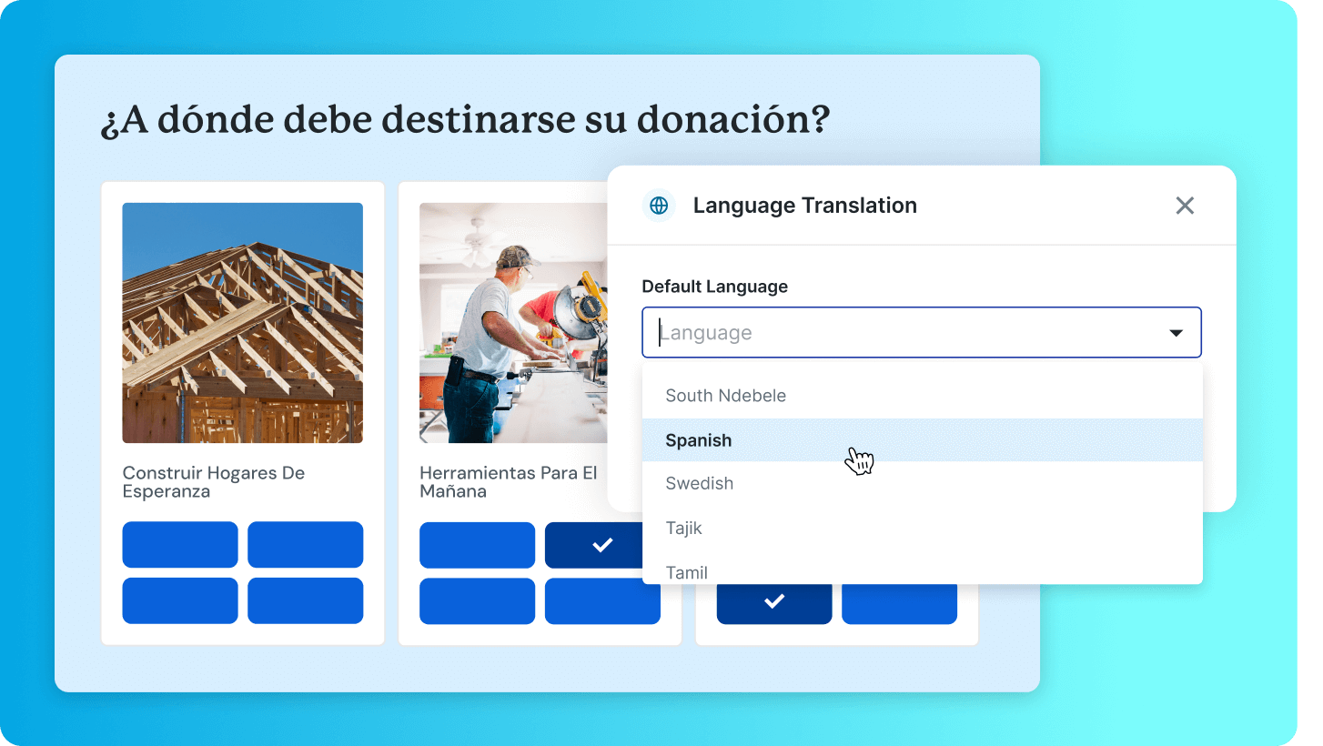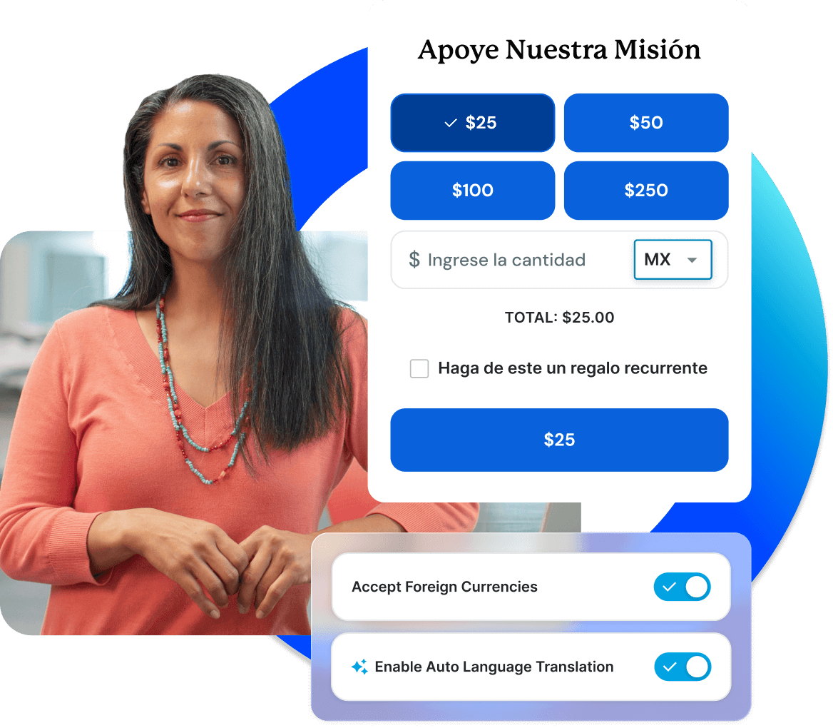 With multi-language support, AI translations, and international currency settlement, you can engage donors in their own language, their own currency, and their own context.